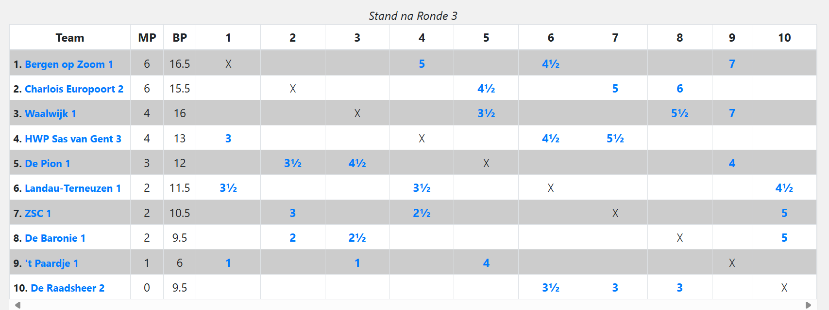 Goed, van de 7 teams waartegen we een kans hebben op matchpunten, hebben we er dus 0 uit 3. En dat zwakke team van ’t Paardje? Die hebben hun eerste matchpunt al binnen, waardoor we momenteel onderaan staan. En ohja, we hebben het makkelijkste programma gehad. Aan het eind van het seizoen degradeert de nummer 10 en de 3 slechtste nummer 9. Het wordt dus tijd voor een tandje bij. Gelukkig kunnen we ons snel revancheren: ronde 4 is over 3 weken op 22 november. Tegenstander daarbij is Bergen op Zoom. Gemiddelde rating tot nu toe: 2061,33. Wat ben ik blij dat ik weer terug ben…